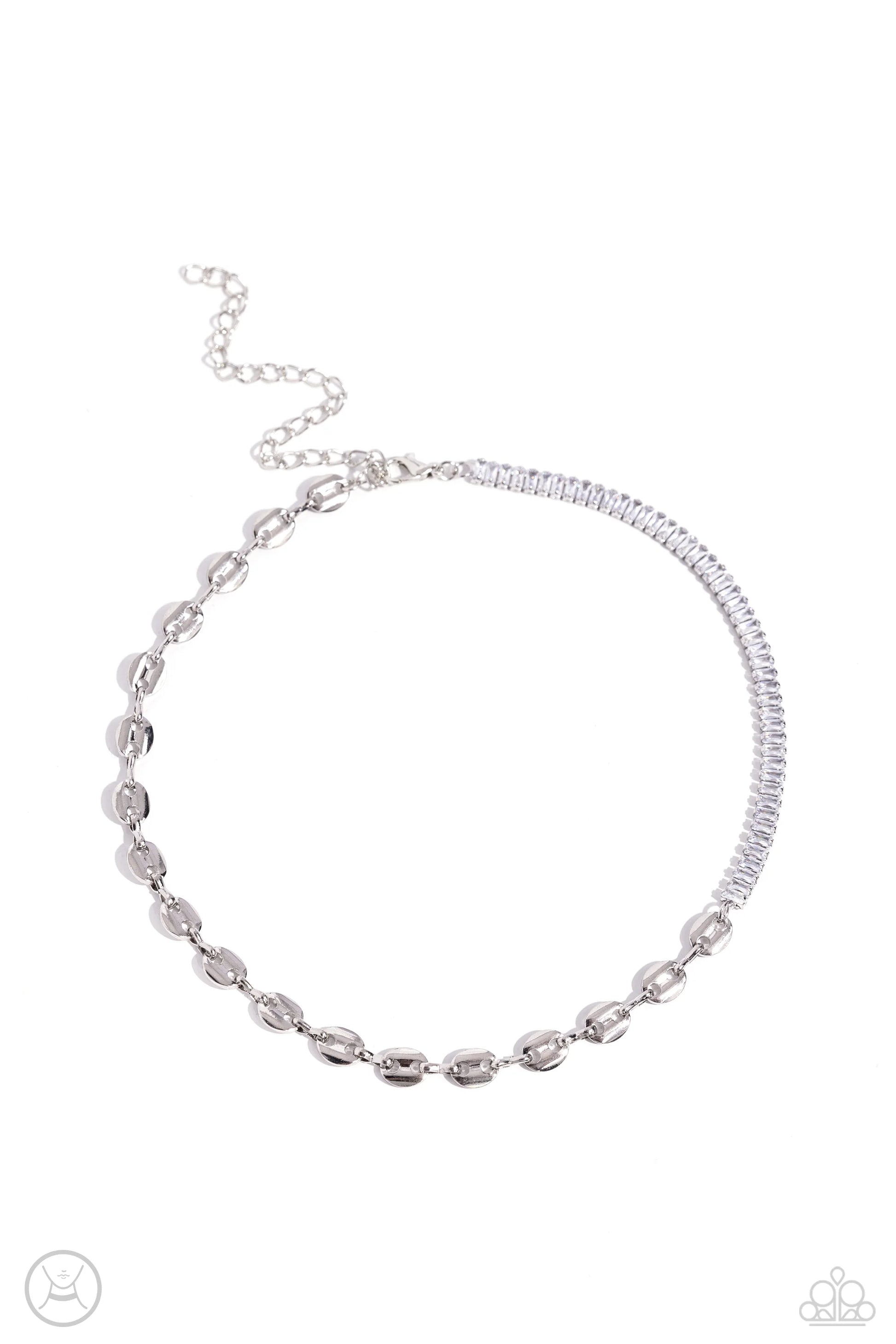 A strand of silver anchor chain collides with emerald-cut white gems that perfectly line up to create an abstract blend of glitz and high sheen. Features an adjustable clasp closure