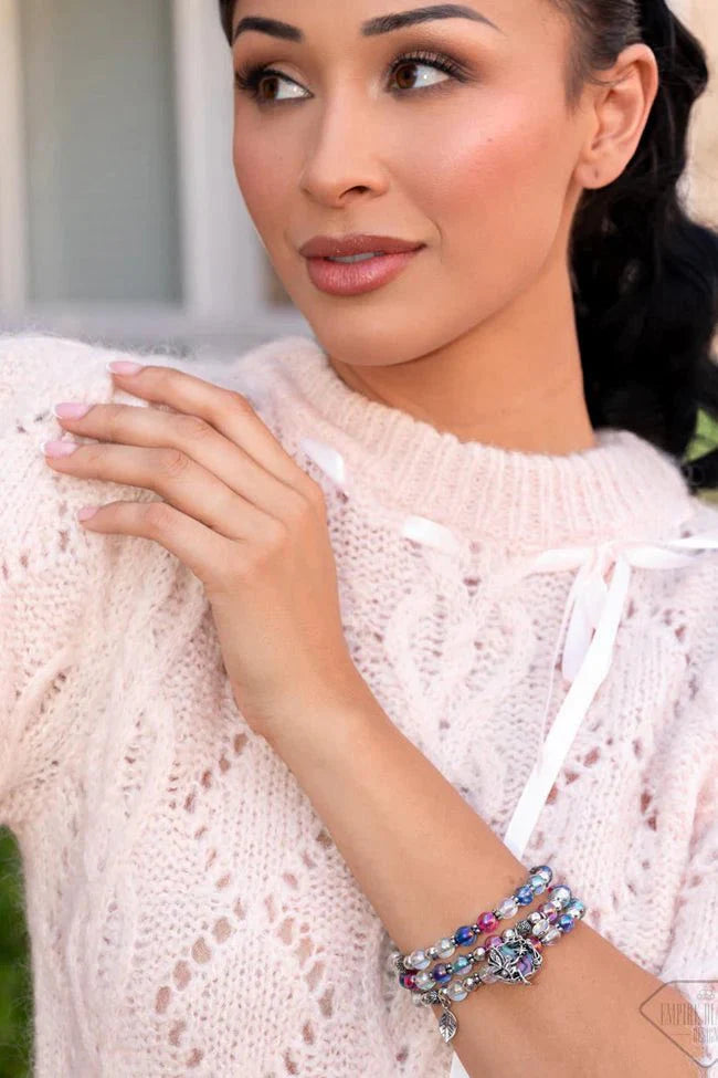 An enchanting assortment of shiny silver and floral embossed beads and bubbly transparent acrylic beads in multicolored shades alternate and pattern along a coiled wire, creating a colorful infinity-style bracelet around the wrist. A white teardrop gem and a textured silver leaf sway beside a thick circular pendant lined with elegantly earthy silver flowers, silver vines, and a three-dimensional star on one side of the circular design, overlapping with an intricately detailed silver fairy to create a whimsical pendant. The fairy, resting in front of a faux abalone shell backdrop seemingly reaches up toward the stars for a hopeful finish