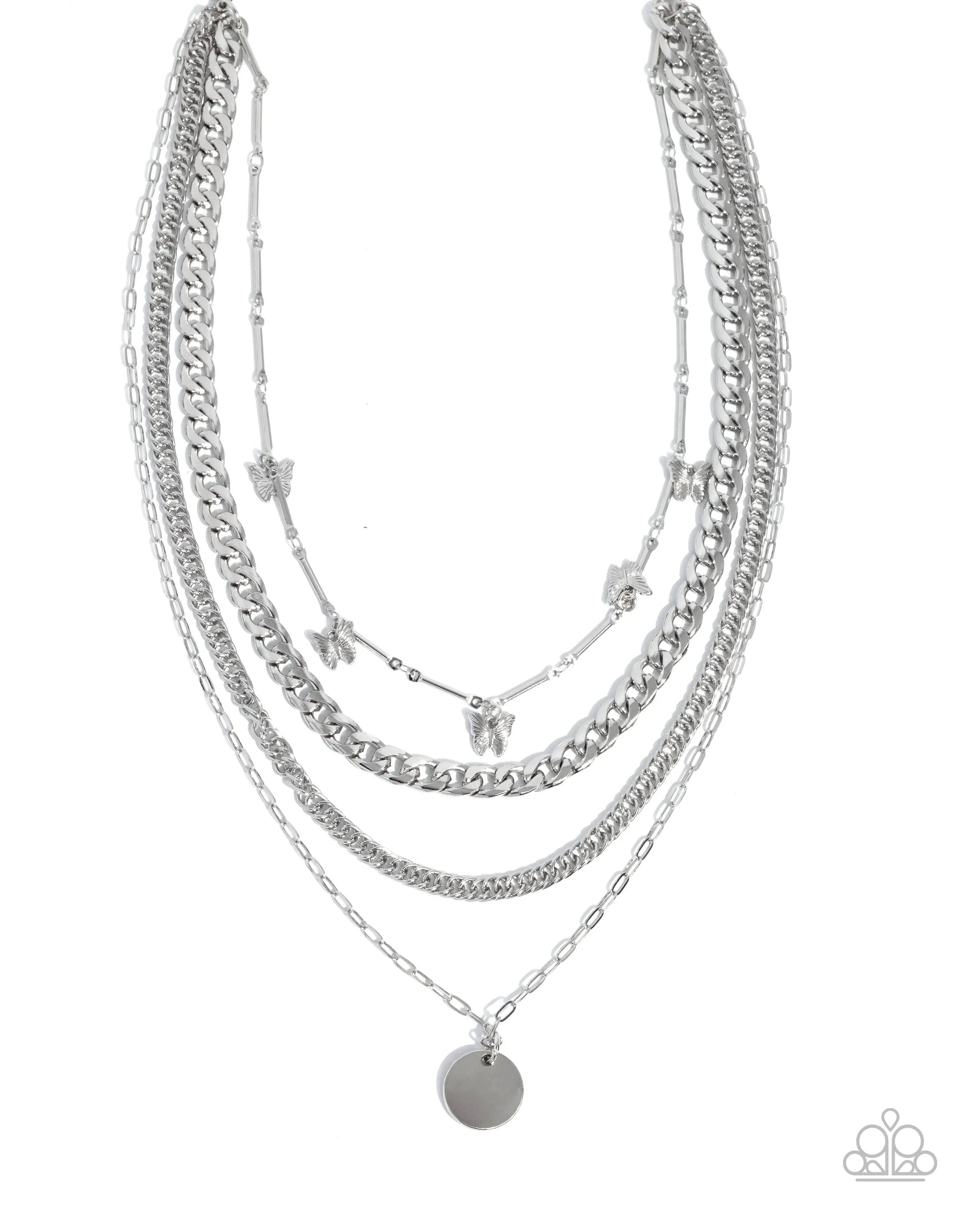 Featuring a high sheen finish, strands of dainty paperclip, elongated and classic curb, and cylindrical link silver chains cascade below the neckline, creating mismatched mesmerizing layers. A collection of subtly textured silver butterflies flutter along the uppermost chain while a silver disc glides along the lowermost chain for a whimsical finish. Features an adjustable clasp closure