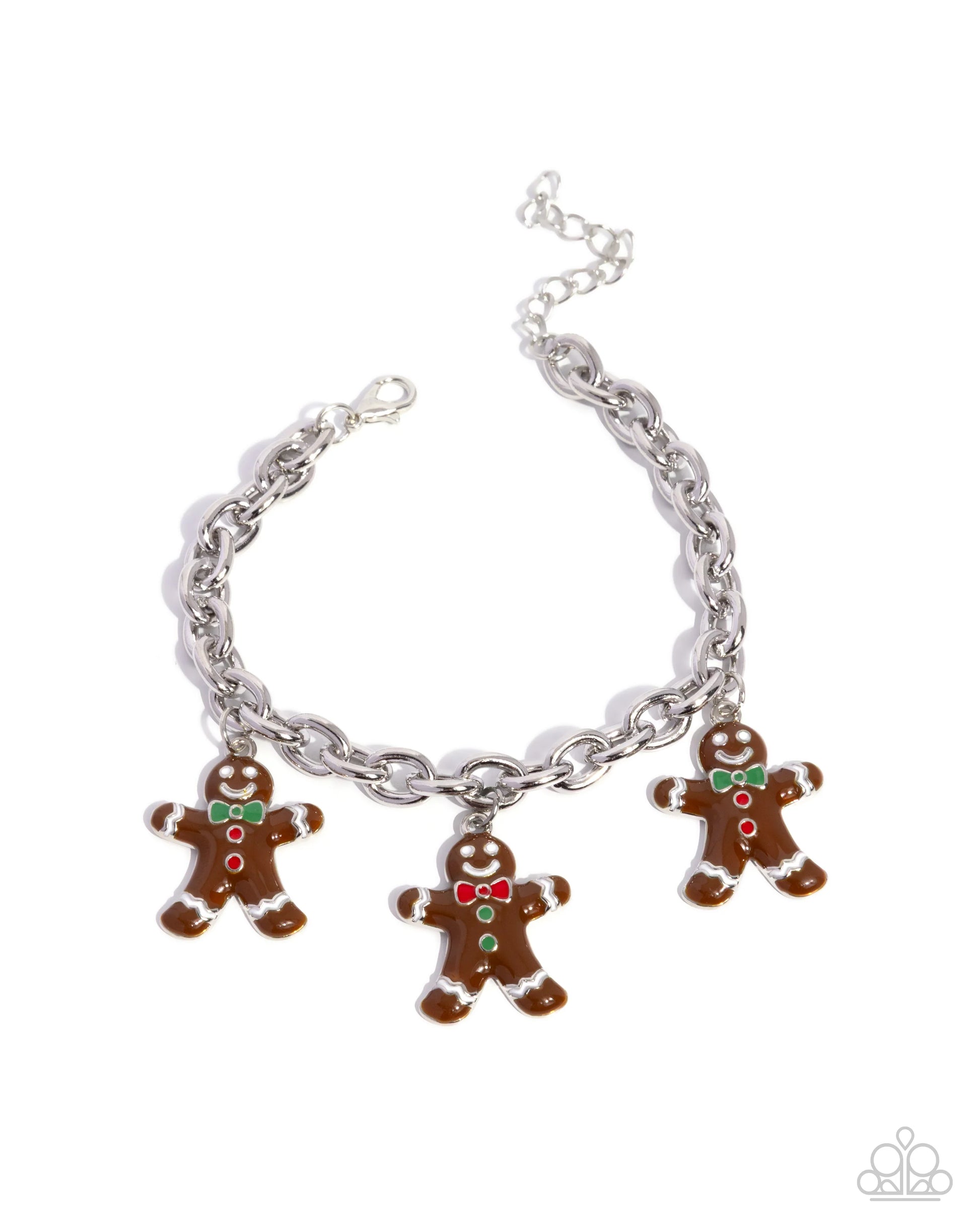 Featuring green, white, and red-painted detailing, a trio of brown gingerbread men alternate in bow tie and button coloring, swaying along a silver cable chain around the wrist for a Christmas-inspired chic look. Features an adjustable clasp closure