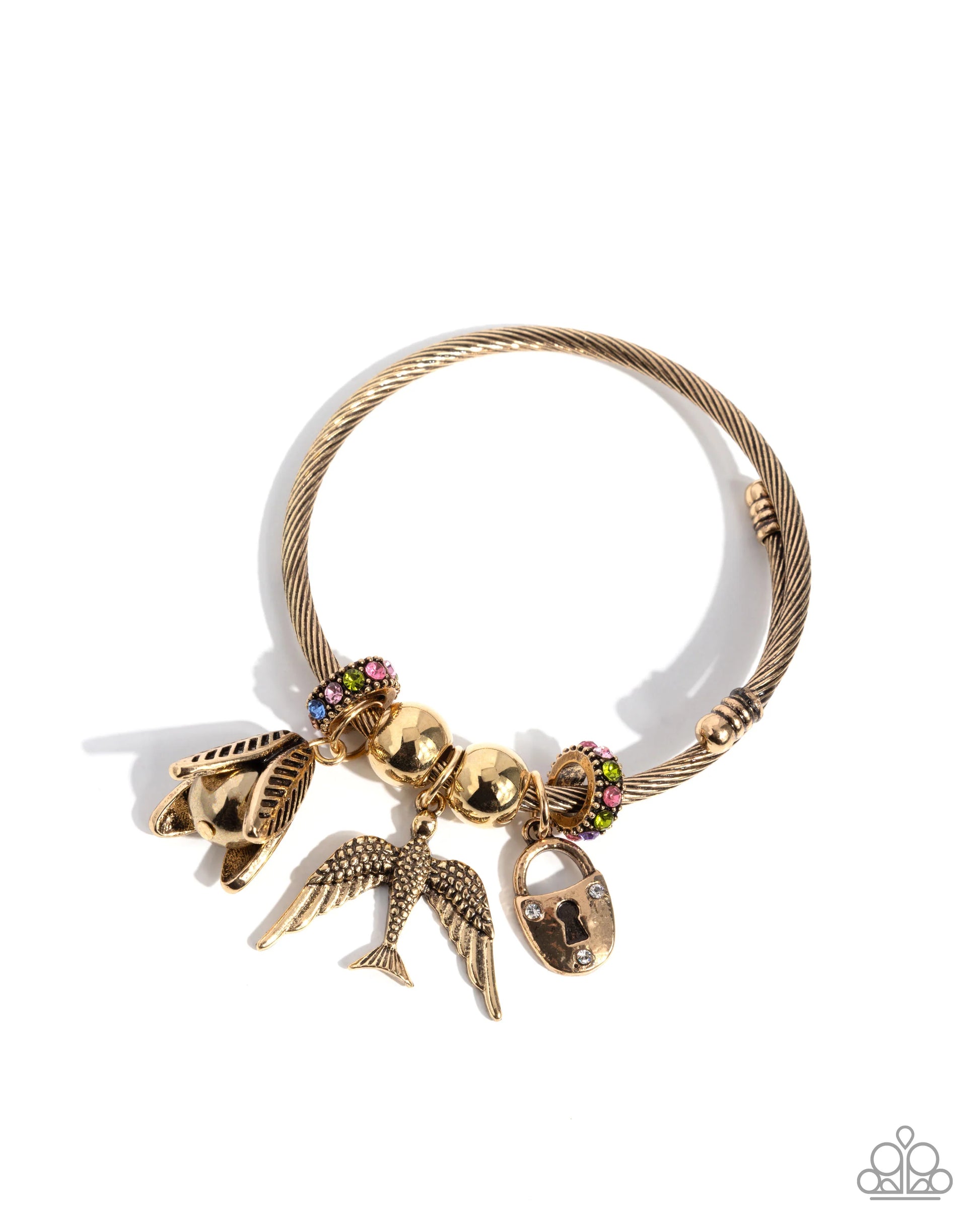 Gold coils around the arm with multi-colored rhinestones circlets, gold beads, a leaf covered charm, delicate lock and a sweet swallow gliding around the coil to set a stunning springtime look