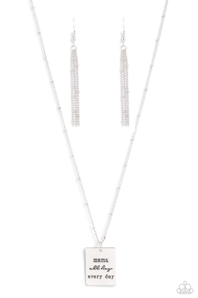 Infused with dainty silver studs on a dainty silver chain, a silver rectangular plate is stamped with the phrase "mama all day every day," for a monochromatic, minimalistic tribute. Features an adjustable clasp closure