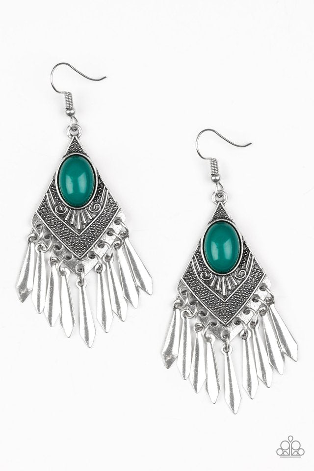 A polished green bead is pressed into a diamond shaped frame radiating with tribal inspired details. Flared silver bars swing from the bottom of the ornate lure, creating a shiny fringe. Earring attaches to a standard fishhook fitting.