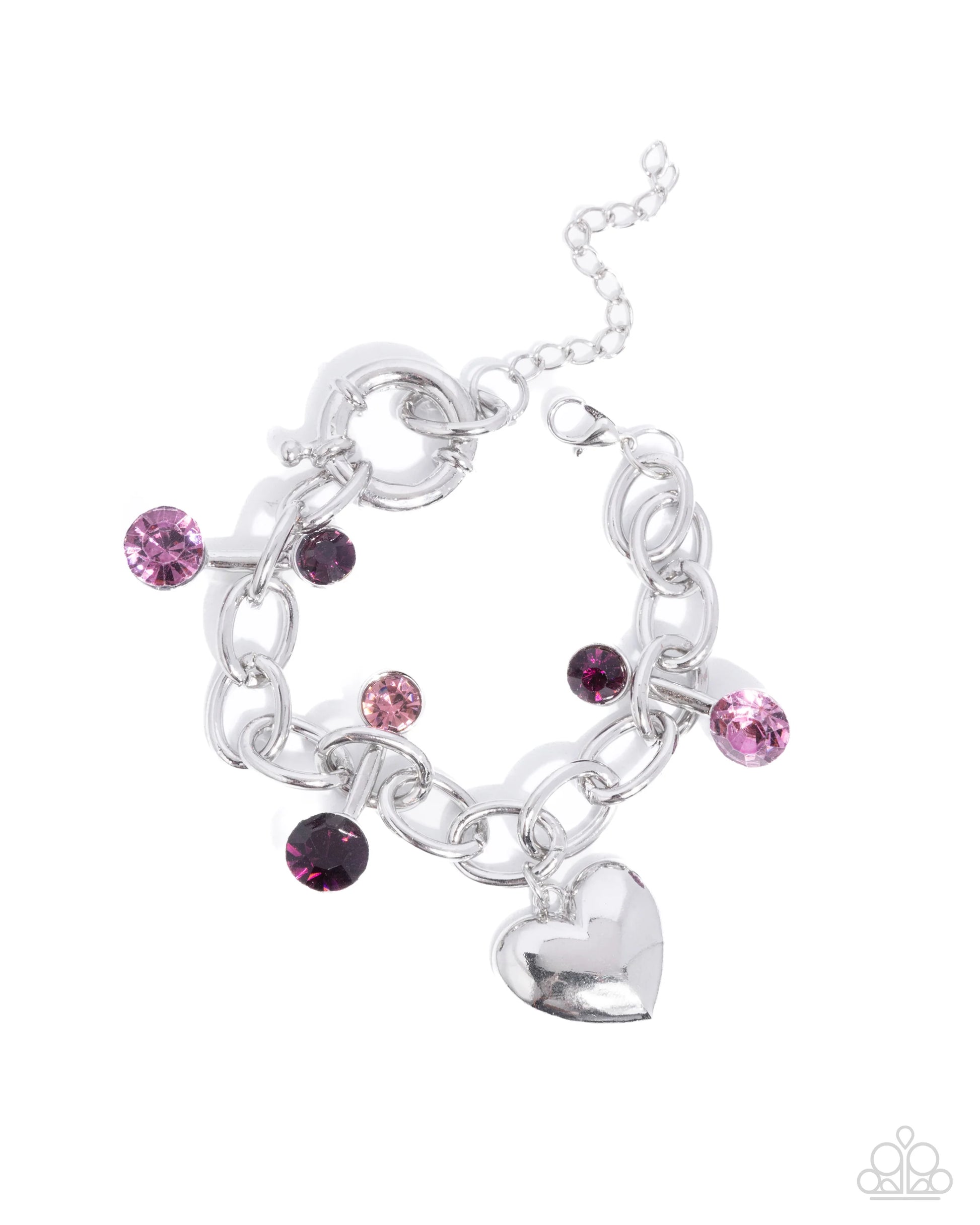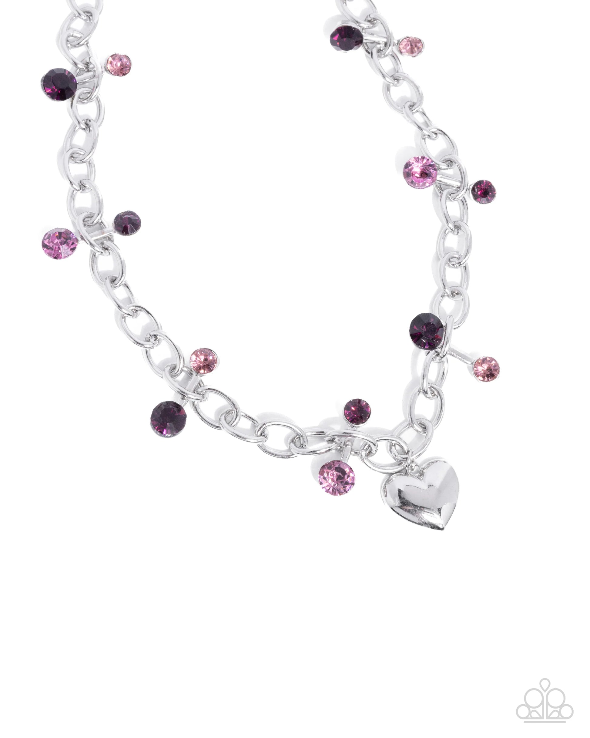 Sporadically threaded through the links of an oversized glistening silver chain, silver bars dotted with haphazardly sized amethyst, and light amethyst rhinestones alternate in direction along the wrist, connecting to an abstract circular fitting. A solitaire silver heart charm swings from the center of the display for a romantic finish. Features an adjustable clasp closure