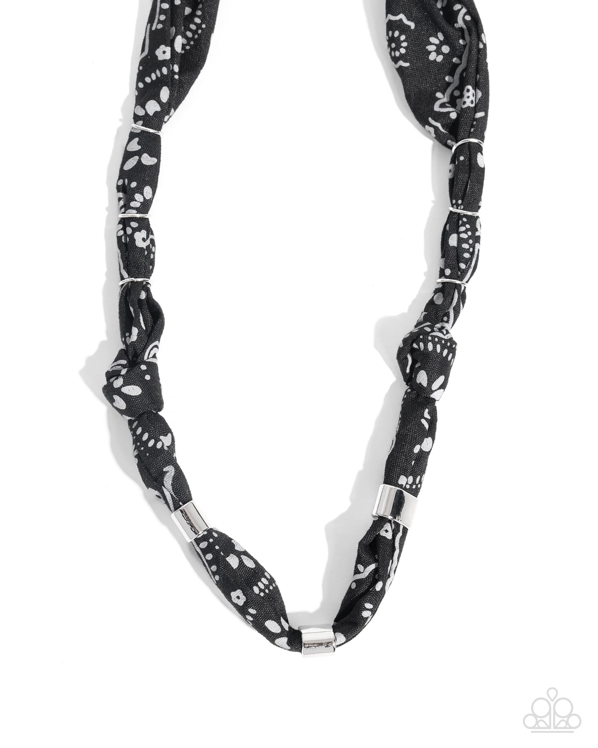 Infused along thick and thin silver rings and beads, a black bandana, patterned with rustic patterns, coalesces below the neckline for a cowboy-inspired couture look. Features an adjustable clasp closure