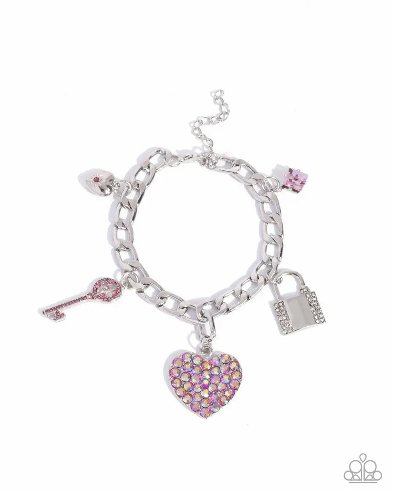 Adorn your wrist with a whimsical charm bracelet featuring a shimmering silver curb chain. Delight in the playful array of a sparkling silver lock encircled by delicate white rhinestones, a vibrant pink square gem, and a rose rhinestone key. An oversized heart with light rose iridescent accents and a fuchsia sunburst finish add a delightful touch of youthful fashion. Adjustable clasp allows for a perfect fit. Color may vary due to its radiant design