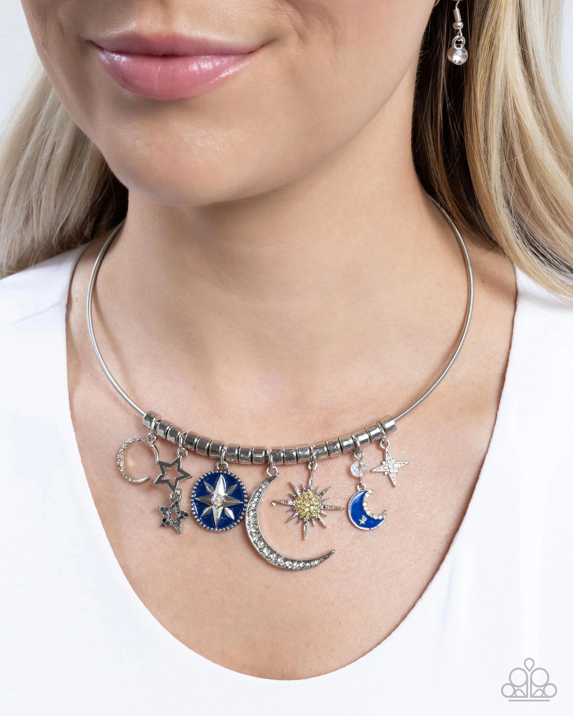 Infused along a dainty silver snake chain, a fringe of celestial charms including crescent moons, stars, three-dimensional stars, and compass-like stars, each featuring navy and royal blue-painted details and a sprinkle of white, iridescent, hematite, yellow, and yellow iridescent rhinestones, sporadically interrupt a collection of sleek silver beads for a whimsically cosmic look below the neckline. Features an adjustable clasp closure. Due to its prismatic palette, color may vary