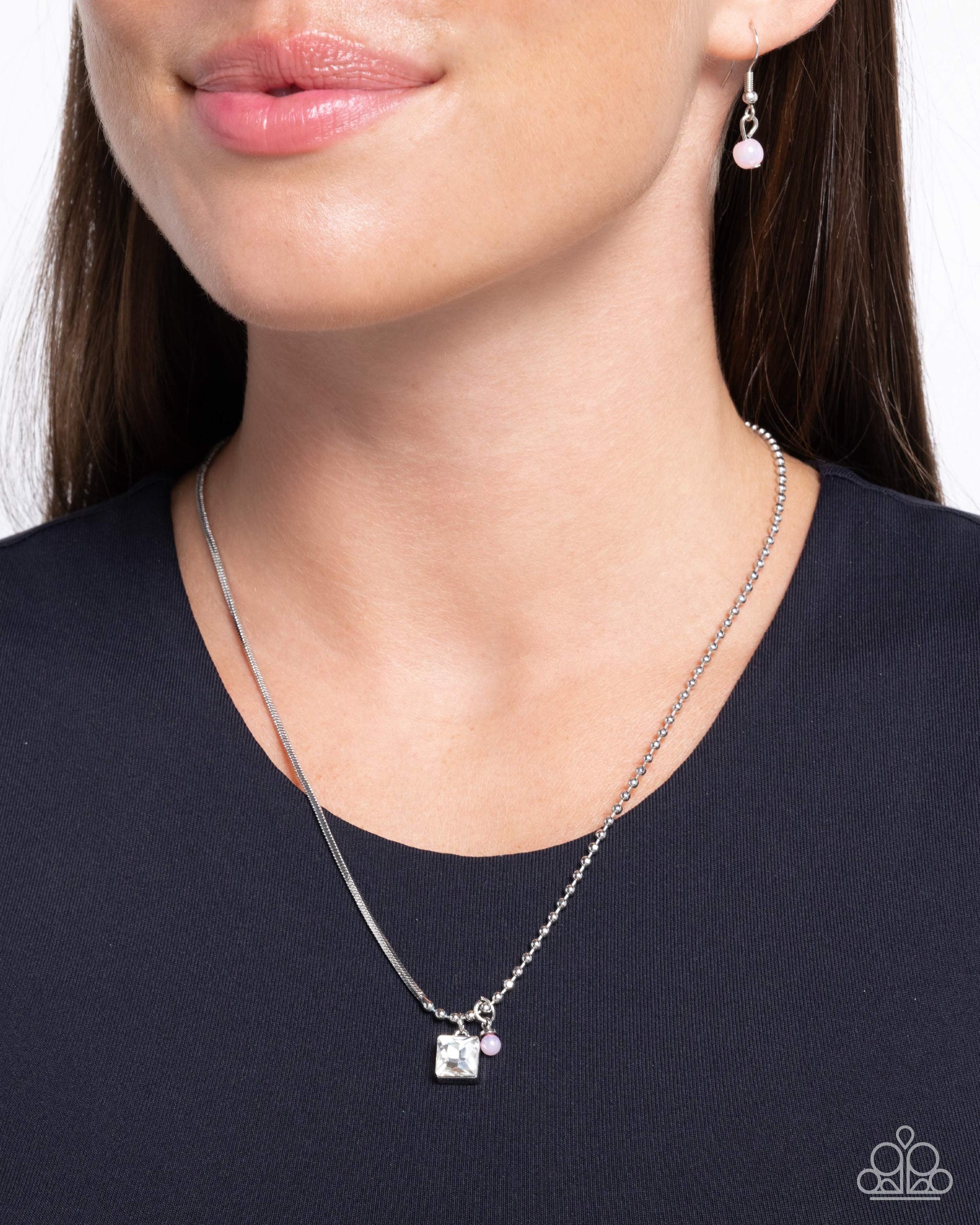 A dainty silver chain collides with a dainty silver ball chain to create an abstract monochromatic blend below the neckline. A solitaire faceted white square-cut gem and iridescent-brushed baby pink pearl glide along the textured chains, perfectly balancing the contrasting design with eye-catching color and shimmer. Features an adjustable clasp closure. Due to its prismatic palette, color may vary