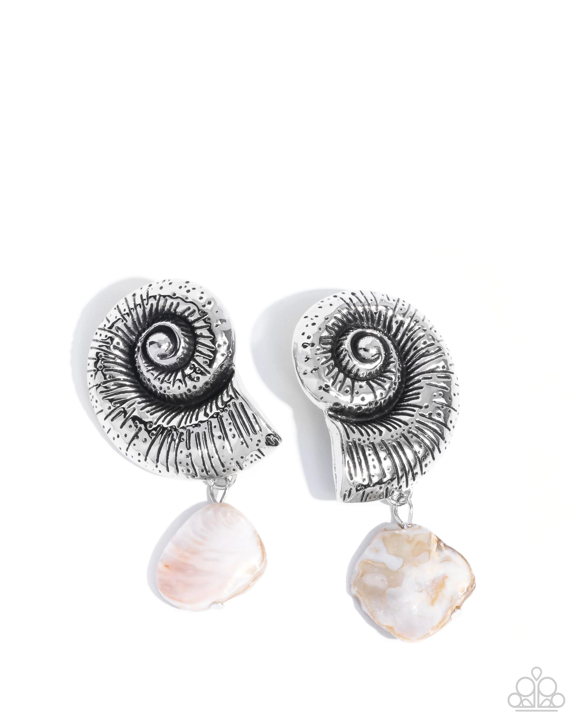 Swirling silver shells cascade into glistening faux shell drops, creating a coastal-inspired statement, adding a touch of oceanic elegance to any ensemble. Earring attaches to a standard post fitting