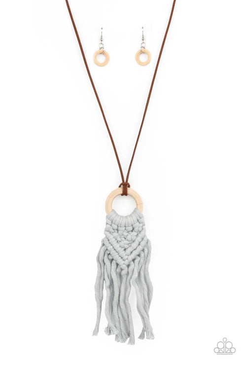 Strands of gray yarn-like thread delicately weaves into a knotted macrame pattern at the bottom of a white wooden hoop. Dainty strands of brown suede knot around the pendant for an earthy flair. Features an adjustable clasp closure
