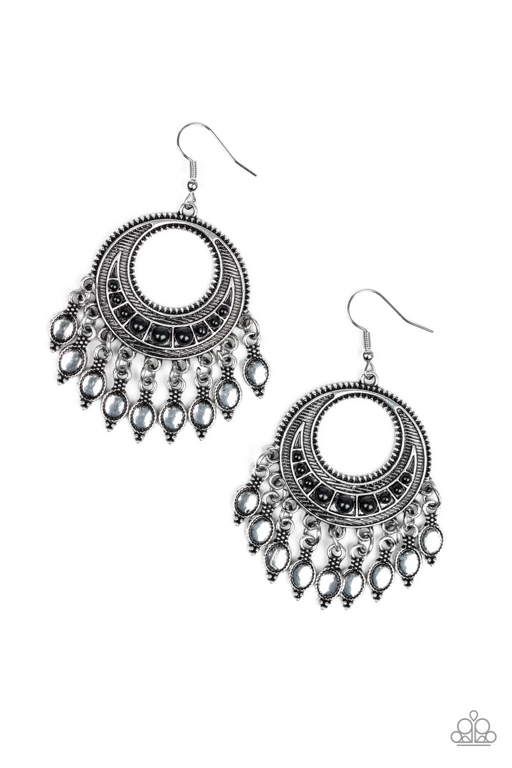 Radiating with linear textures, the bottom of an ornate silver hoop is embossed in a half-moon pattern and dotted in shiny black beads. The colorful frame gives way to a fringe of decorative silver beads for a wanderlust finish. Earring attaches to a standard fishhook fitting.