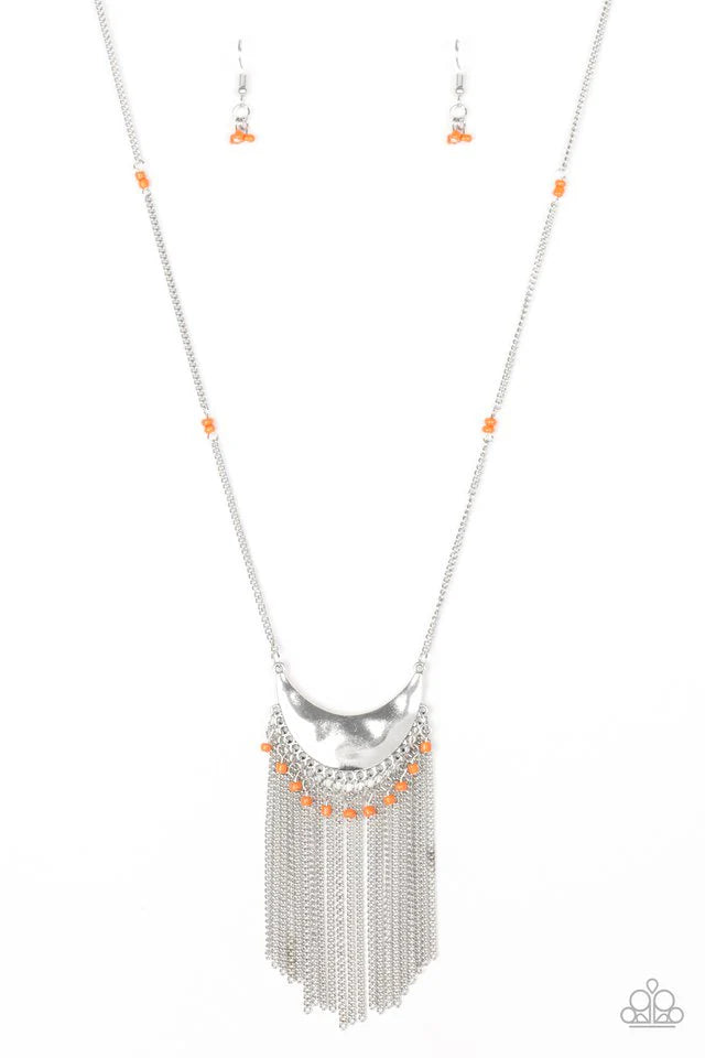 A delicately hammered silver crescent swings from the bottom of an elongated silver chain infused with orange seed bead accents. The tribal inspired pendant gives way to a shimmery fringe sprinkled with more seed beads for a wanderlust finish. Features an adjustable clasp closure. Sold as one individual necklace. Include one pair of matching earrings