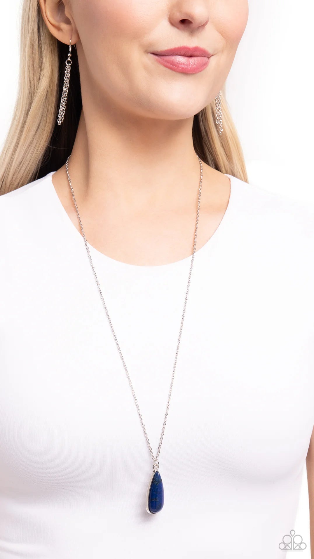 Wrapped in a silver frame, a lapis teardrop stone glides from an elongated silver chain for an earthy centerpiece against the chest. Features an adjustable clasp closure. As the stone elements in this piece are natural, some color variation is normal