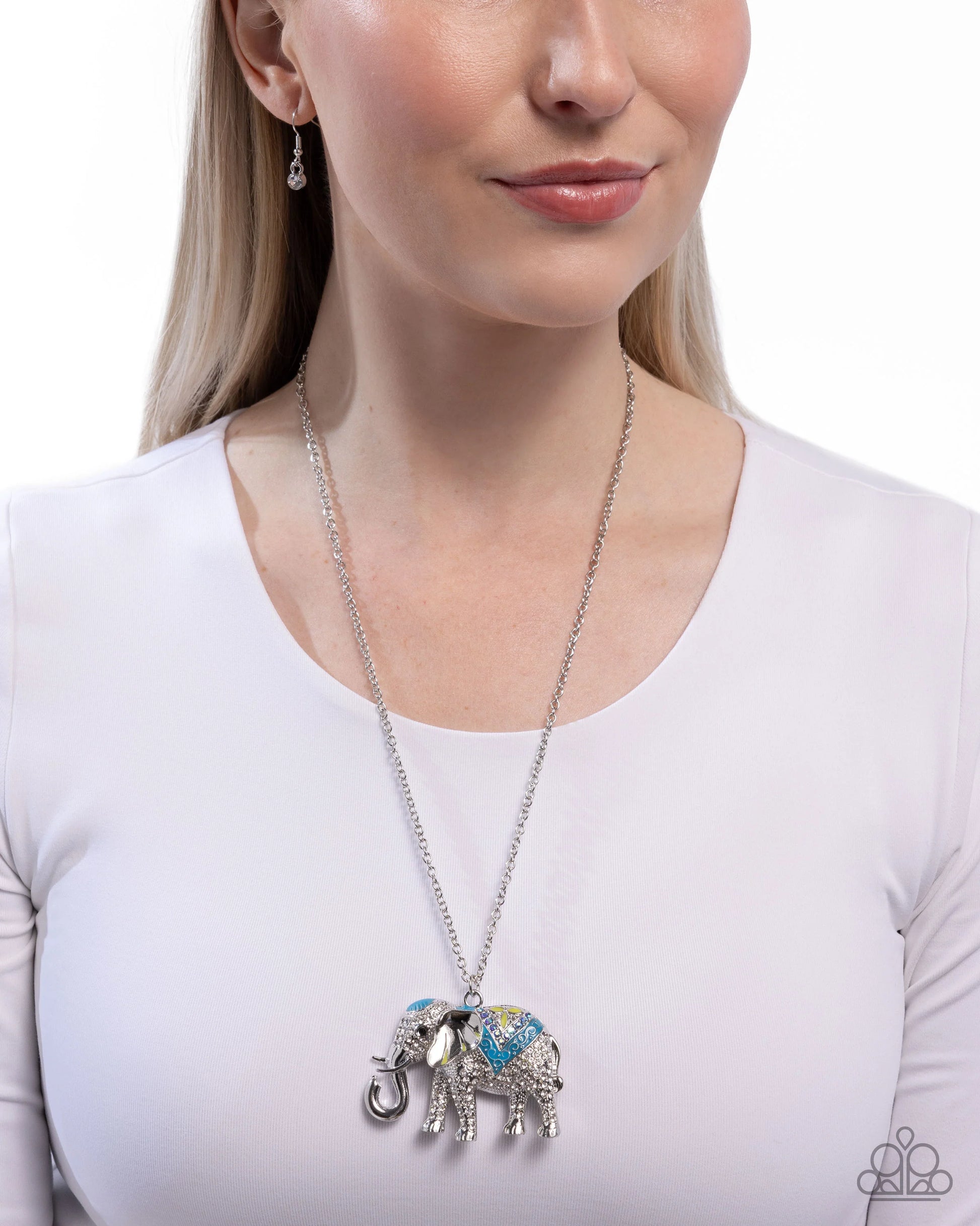 Featuring turquoise and Misted Marigold-painted ornate details and light sapphire iridescent rhinestones, a silver elephant complete with a white rhinestone-dusted body gracefully glides below the neckline from a classic silver chain for an elegantly enlightened display. Features an adjustable clasp closure. Due to its prismatic palette, color may vary