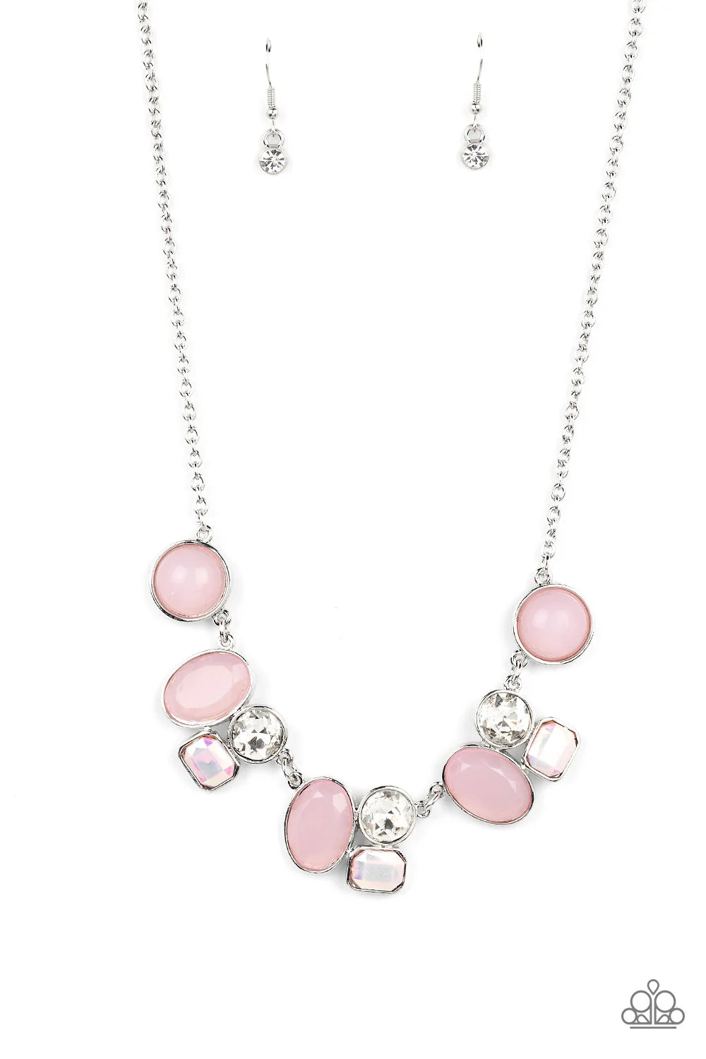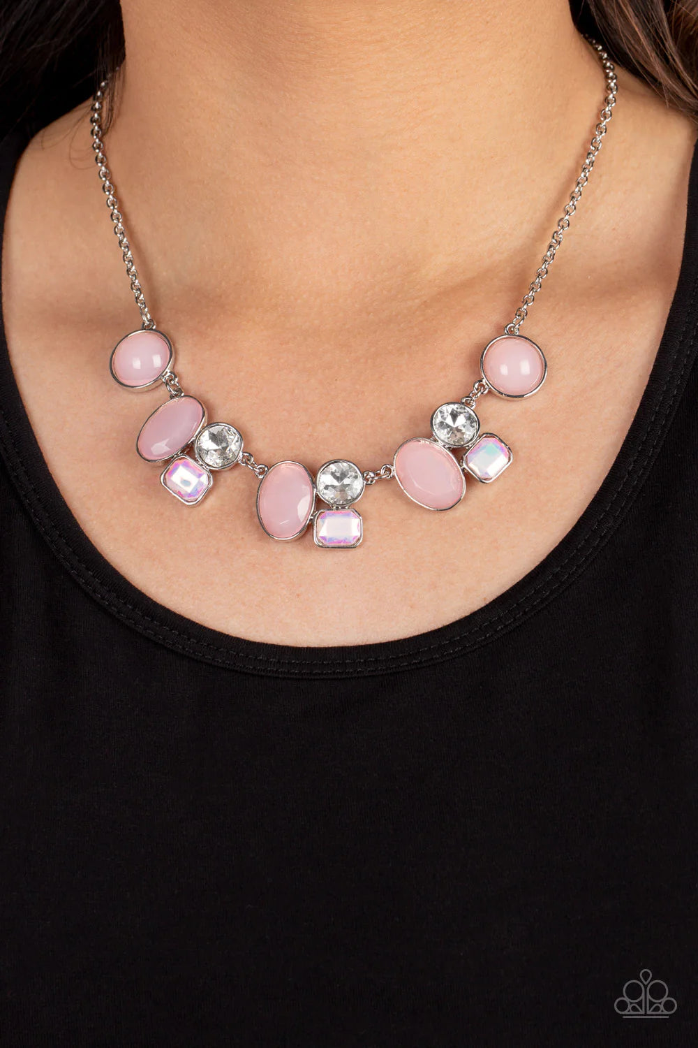 Opaque Baby Pink beads in perfectly polished circles and faceted ovals are pressed into silver frames as they connect with exaggerated classic white rhinestones stacked above emerald cut iridescent gems to create an intricate geometric display. Features an adjustable clasp closure. Due to its prismatic palette, color may vary