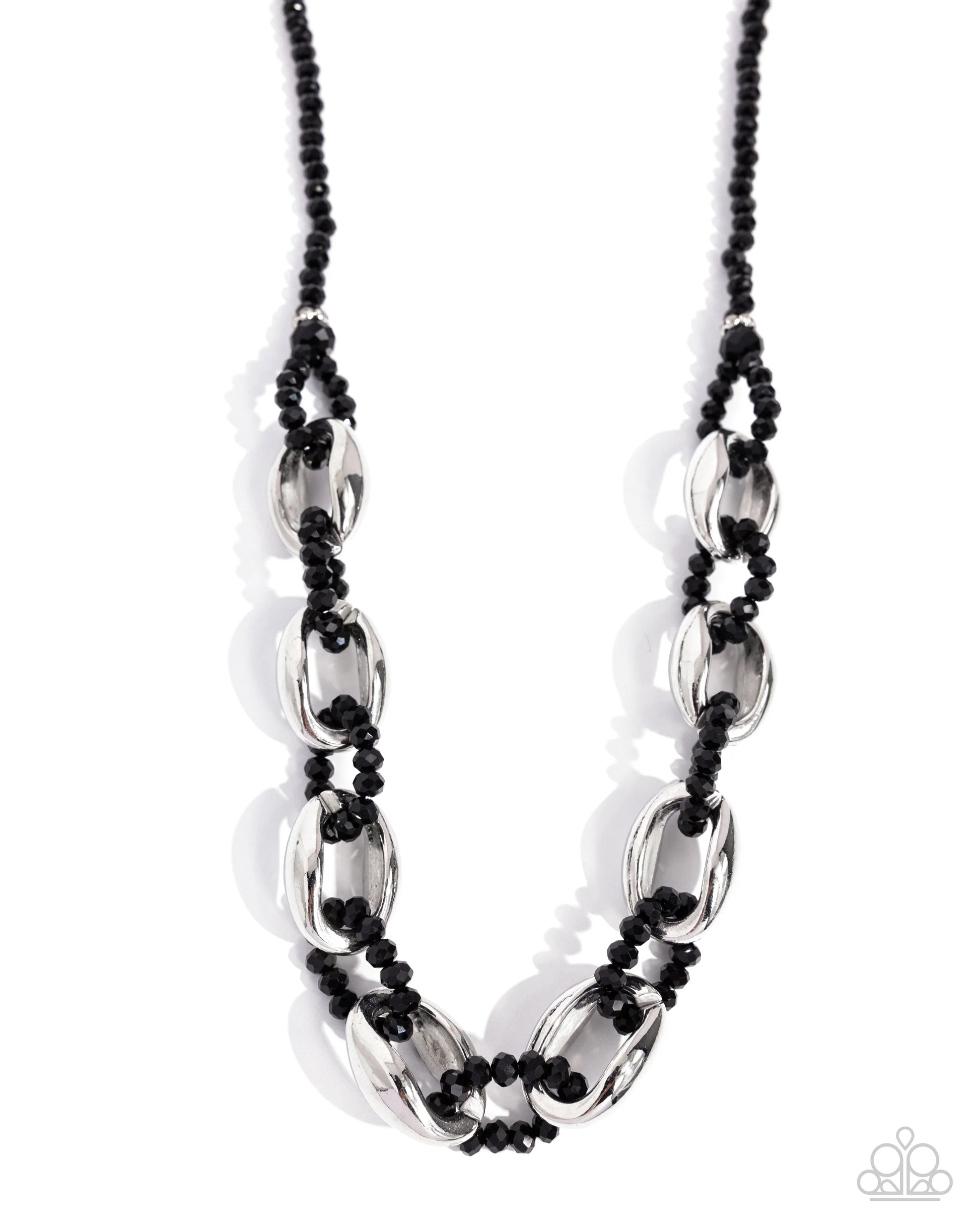 Infused along an invisible string, a collection of defaced black beads flicker and flash along the neckline and into dynamic hoops that alternate with elongated bold silver rings for an iconic intrepid look. Features an adjustable clasp closure