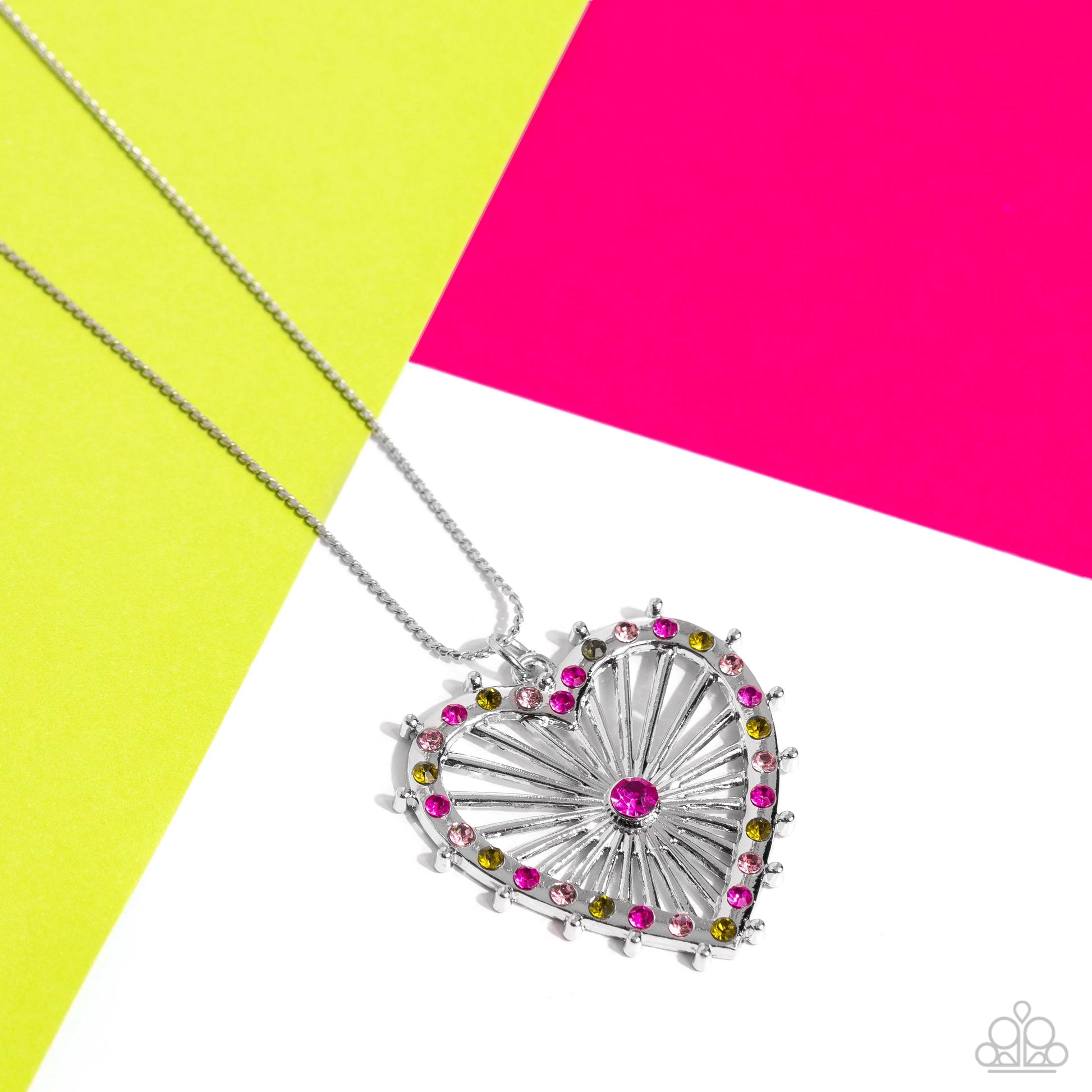 Dotted with glittery fuchsia, olive green, and light pink rhinestones, an oversized heart frame radiating with linear texture topped with a fuchsia rhinestone center swings from the bottom of a lengthened dainty silver chain for a carnival-inspired look. Features an adjustable clasp closure