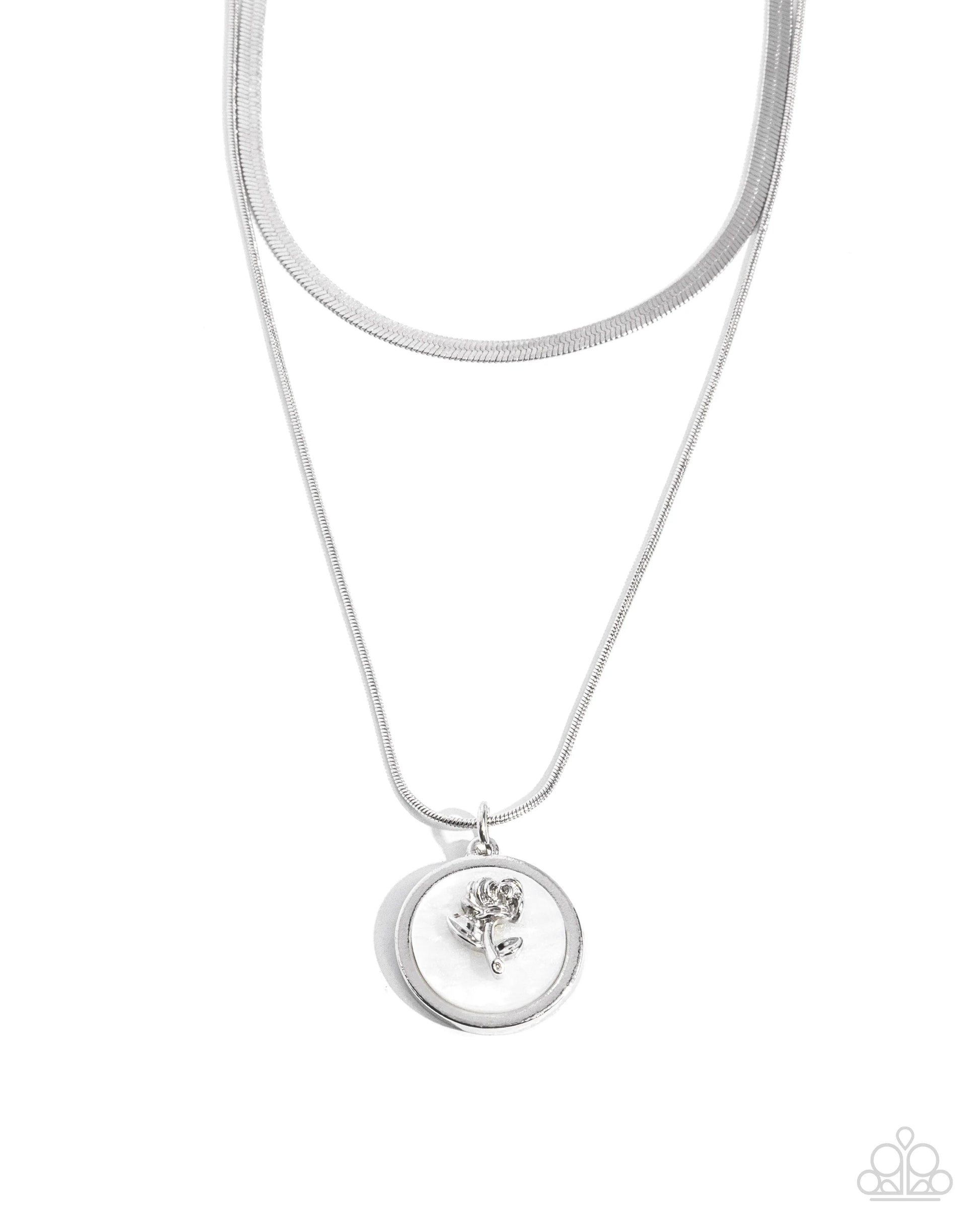 Featured in the center of a white shell, a glistening silver rose pendant glides along a dainty silver chain. A bold silver herringbone chain layers above the rosy display for an additional touch of grit and glitz. Features an adjustable clasp closure