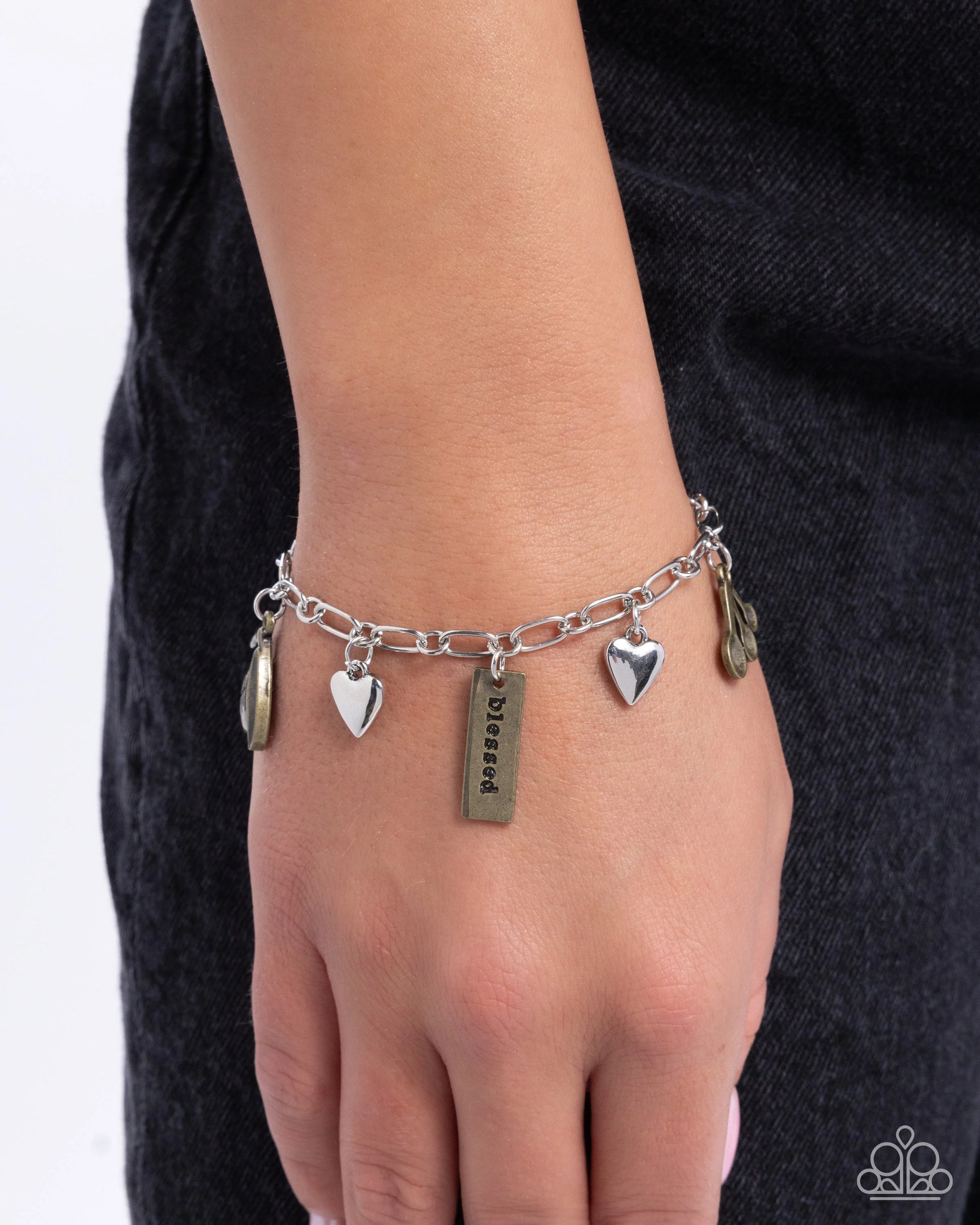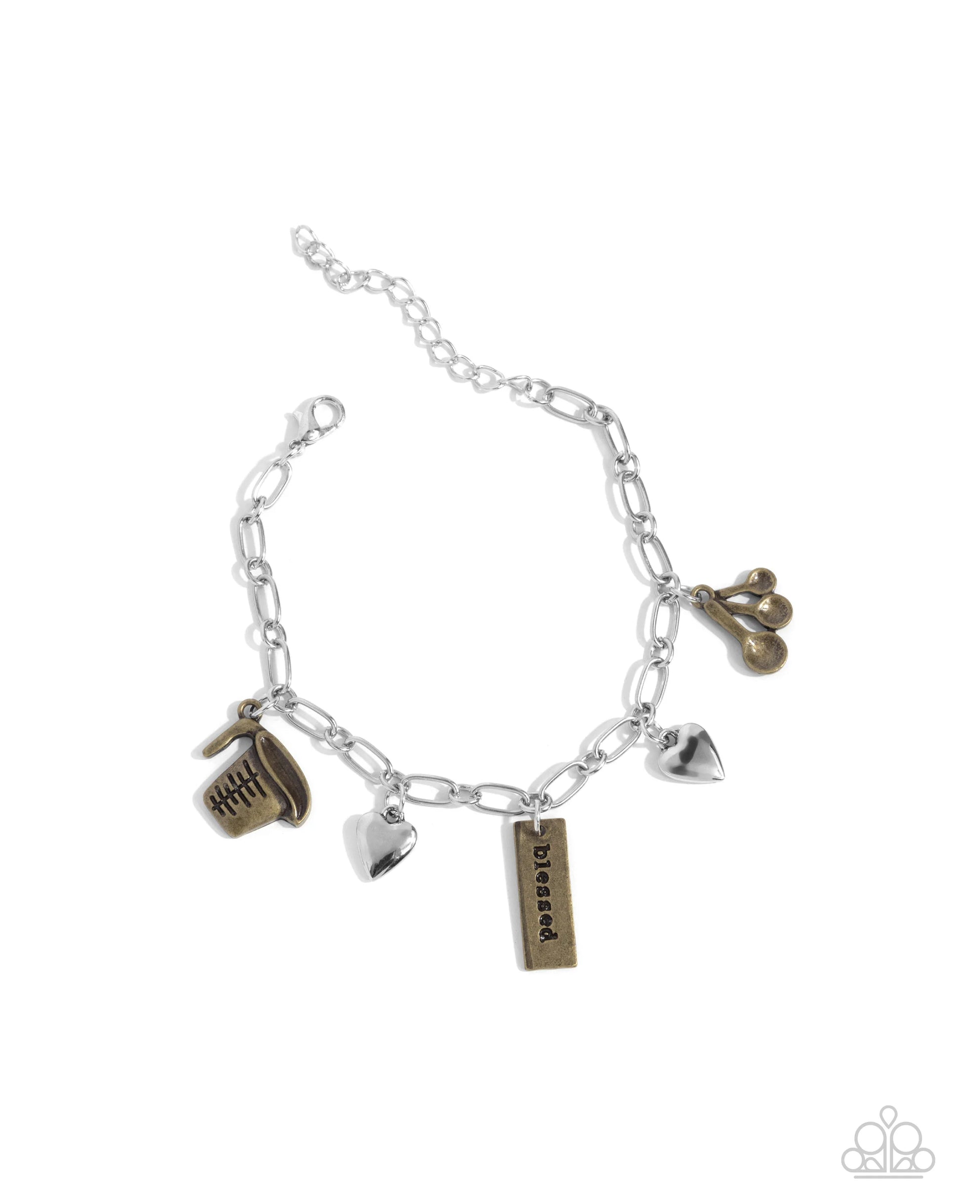 Modeled after the phrase "Glass Half Full" inspiring brass and silver charms including a brass measuring cup, brass measuring spoons, a vertical brass bar with the stamped word "blessed," and a duo of silver hearts sways along a silver paperclip chain along the wrist. Features an adjustable clasp closure