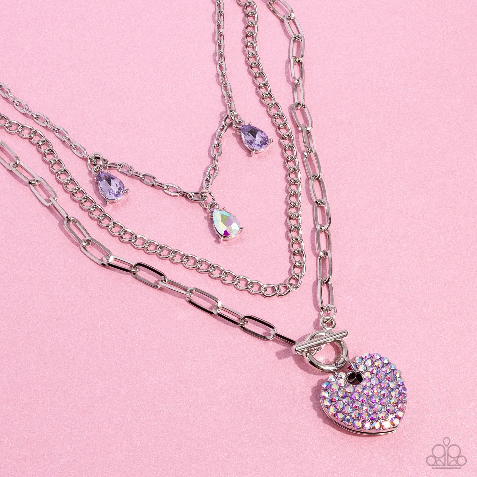 Three mismatched silver chains layer and loop around the neckline. Two purple and an iridescent teardrop gem in silver-pronged fittings dangle from the uppermost chain while a lavender iridescent-rhinestone encrusted heart pendant loops through the lowermost chain for a radiantly, romantic statement. Features an adjustable clasp closure. Due to its prismatic palette, color may vary