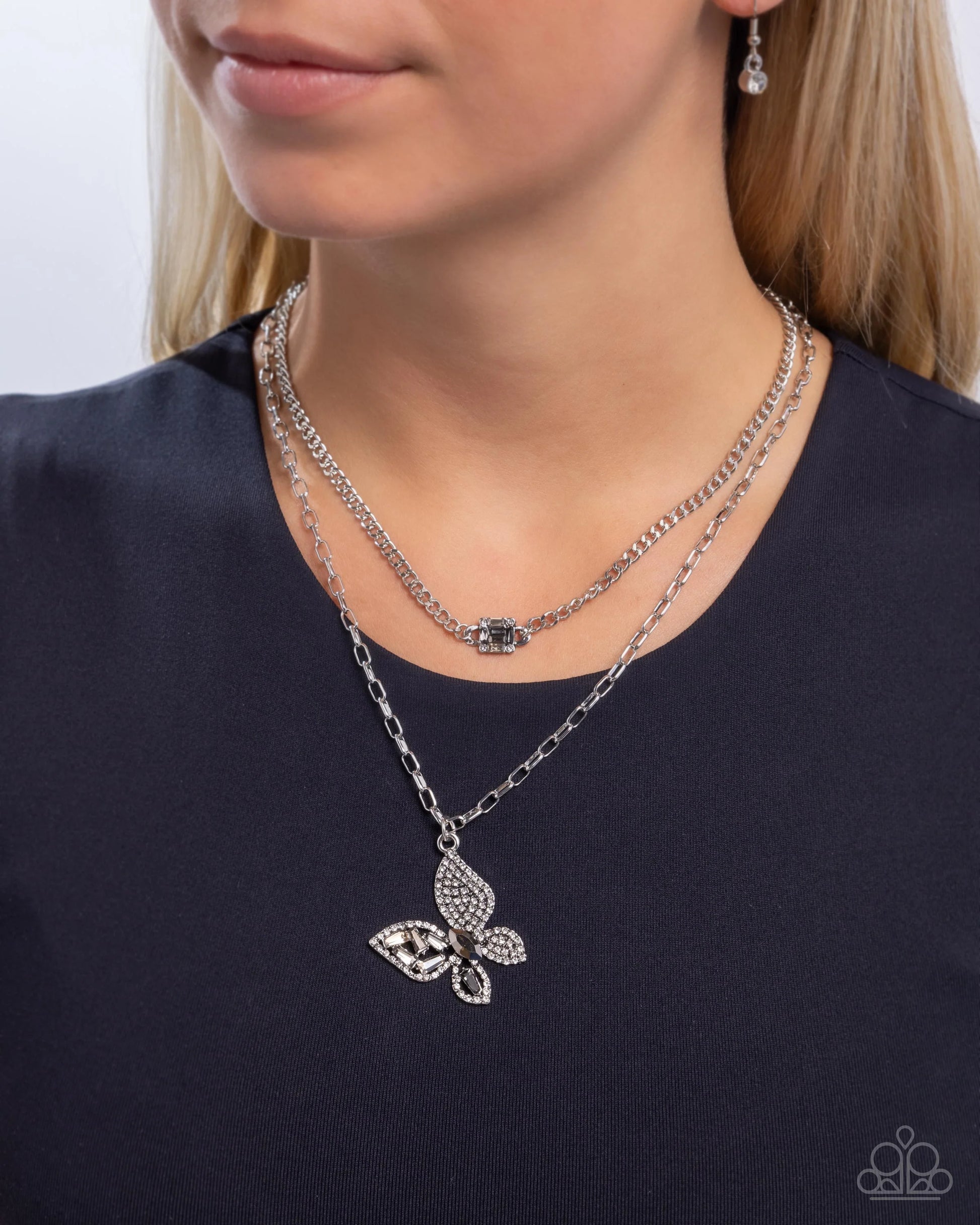 Two strands of varying silver chains drape along the neck. The shorter chain is accented with a pendant made up of hematite, white, and smoky emerald-cut rhinestones, while the longer chain features a butterfly pendant encrusted with white, hematite, and smoky rhinestones. The butterfly pendant strikes a balance between bold and intricate, making it a standout piece. Features an adjustable clasp closure