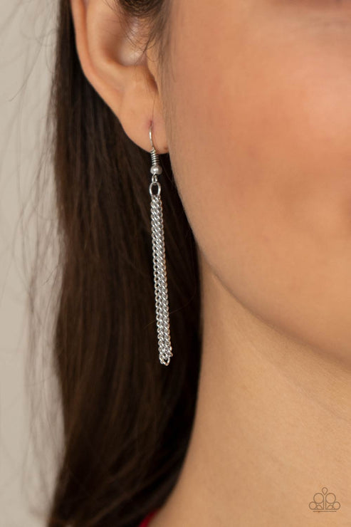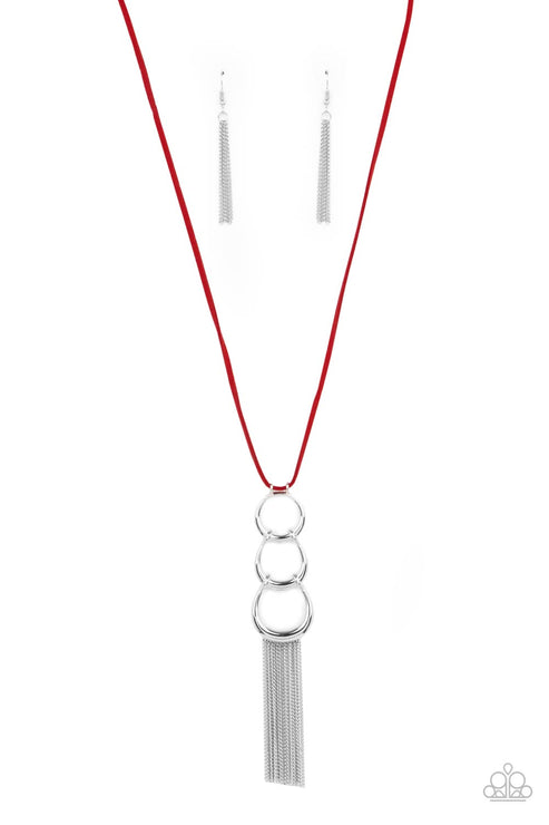 A bold silver ring gives way to two interlocking half moon silver frames at the bottom of a lengthened piece of red suede. Shimmery silver chains swing from the bottom of the display, adding flirty movement to the stationary pendant. Features an adjustable clasp closure