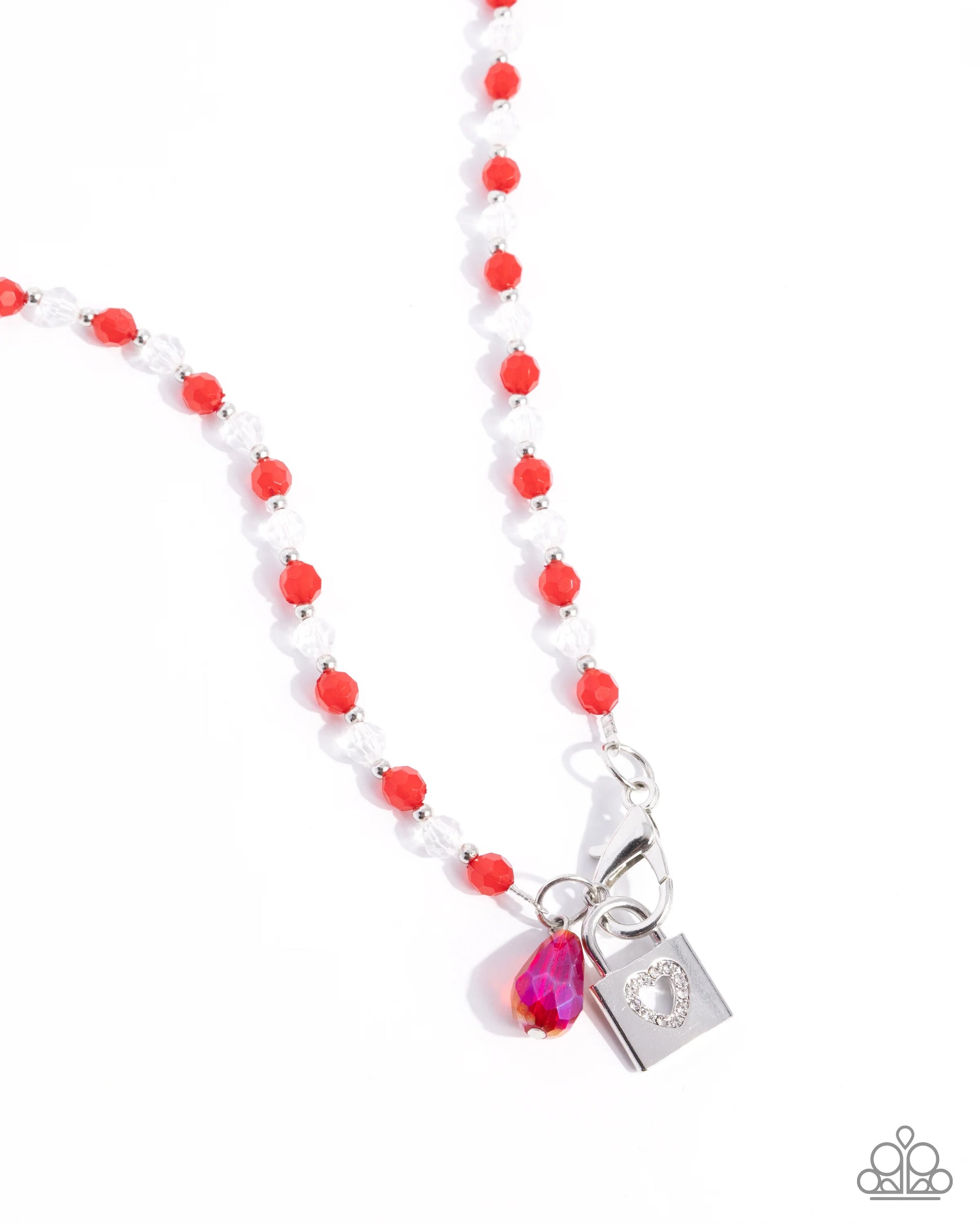 Infused along an invisible string, a collection of faceted red and clear beads alternates with dainty silver studs around the neckline for a faceted flair. Dusted in white rhinestones, a silver heart silhouette padlock, and a UV shimmery red teardrop bead swing from the beaded strand for a romantic finish. Features a clasp closure
