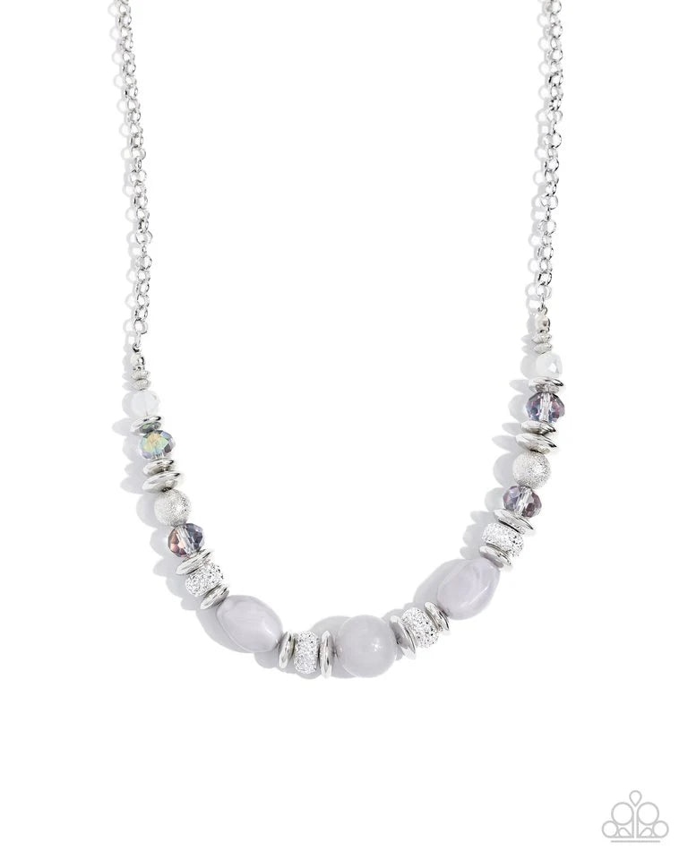Elegant and luminous, this exquisite necklace showcases a harmonious blend of faceted white and smoky beads, shimmering silver discs, and sparkle-infused silver beads. Adding to the allure are Northern Droplet beads in diverse shapes and unique hammered rings, all gracefully draping below a timeless silver chain. The design is completed with a practical adjustable clasp closure for a perfect fit