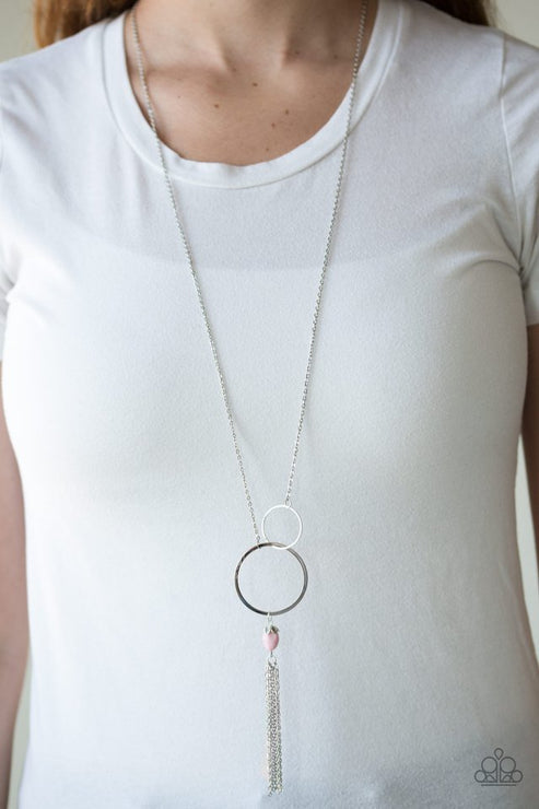 Varying in size, two glistening silver hoops connect at the bottom of a lengthened silver chain. Infused with a pink bead, a shimmering silver tassel swings from the bottom of the hoops, adding a flirty tassel to the adventurous vibe. Features an adjustable clasp closure. Sold as one individual necklace. Includes one pair of matching earrings