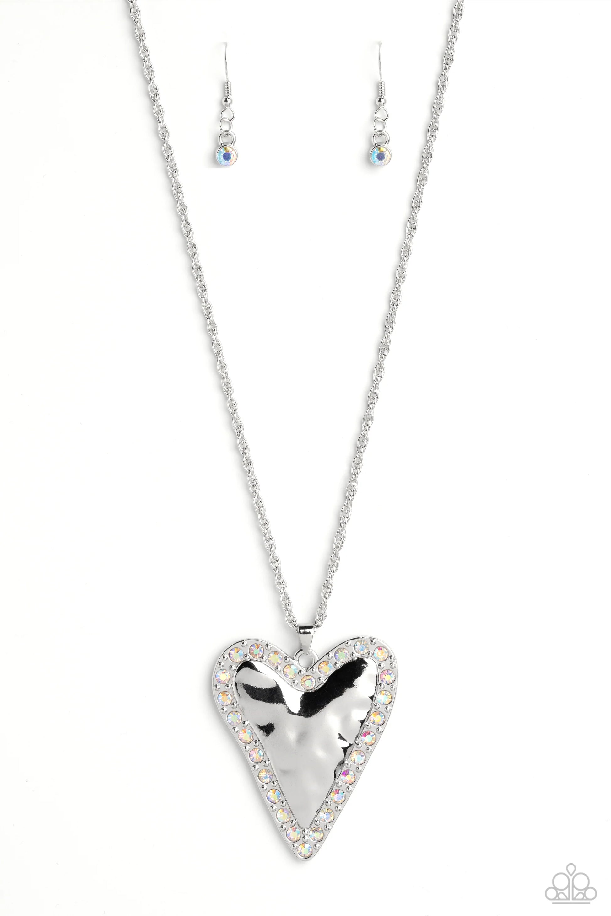 Hammered in antiqued texture, an oversized, abstract silver heart swings from the bottom of a silver chain for a whimsical look. Silver studs and glittery iridescent gems border the hammered texture for a touch of bling. Features an adjustable clasp closure. Due to its prismatic palette, color may vary