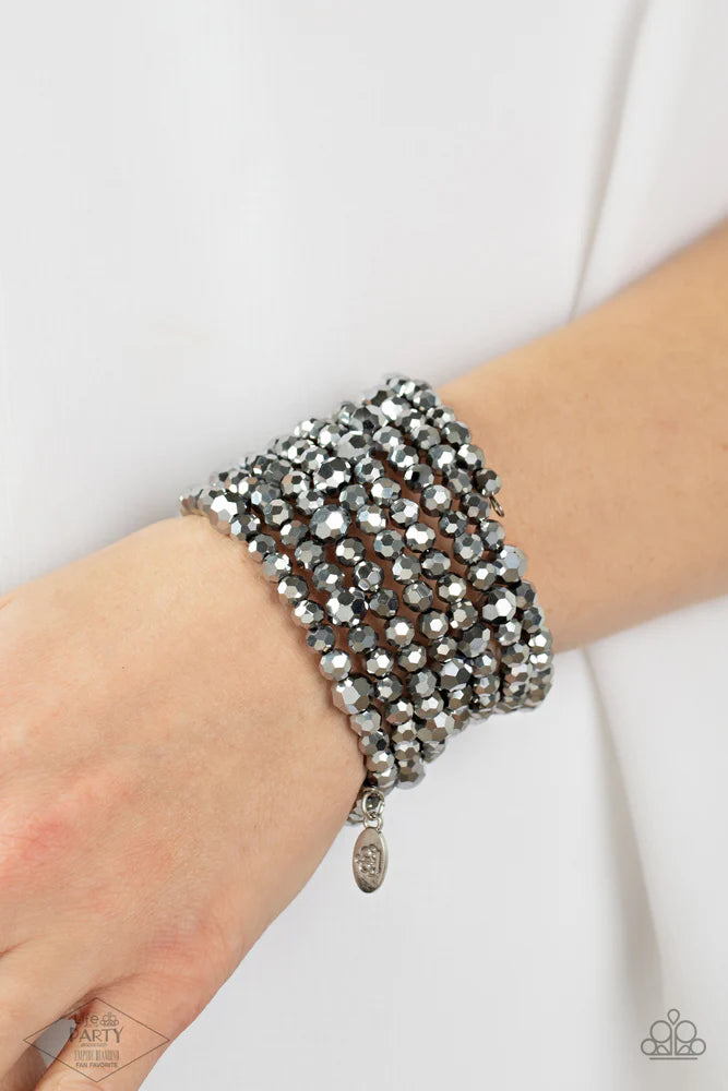 Faceted hematite beading is threaded along a shimmering wire, creating spiraling sparkle as the glittery infinity bracelet wraps around the wrist