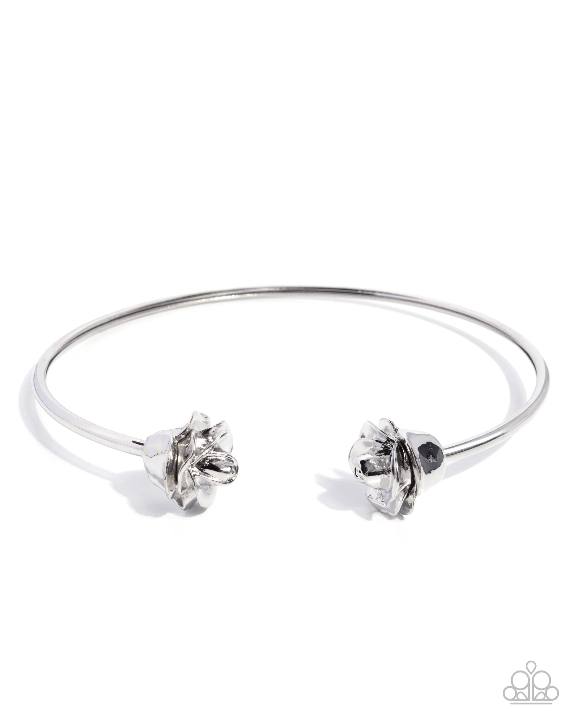 A thick, silver collar wraps around the neck in a high-sheen finish. Each open end is capped with a silver rose, creating a statement-making finish. Features a flexible, open-ended design