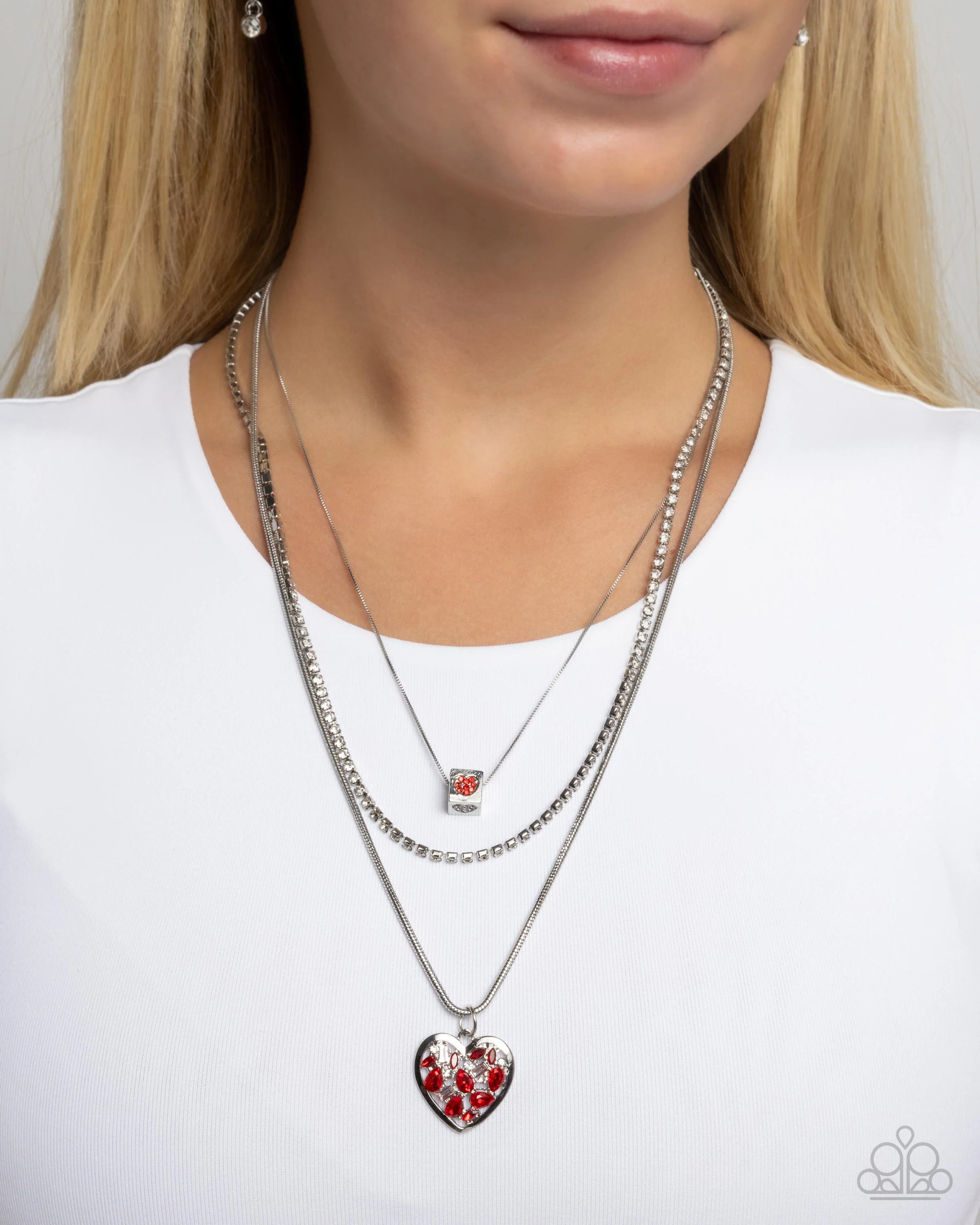 A mismatched collection of dainty silver box, silver snake, and white rhinestones in square silver pronged fittings layers below the neckline. Gliding along the uppermost dainty box chain, a silver cube with white, light rose, light red, and red rhinestone hearts on various sides shimmers. Featuring additional red and white shades, a collection of marquise-cut, emerald-cut, teardrop, and round rhinestones and gems scatter atop the front of a silver heart pendant that glides along the lowermost chain for a heartfelt finish. Features an adjustable clasp closure.