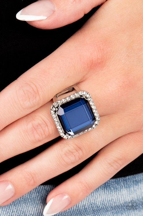 A lavish square Skydiver gem, encased in a border of dainty white rhinestones, makes a head-turning centerpiece as it gleams with an industrial edge atop the finger. Features a stretchy band for a flexible fit