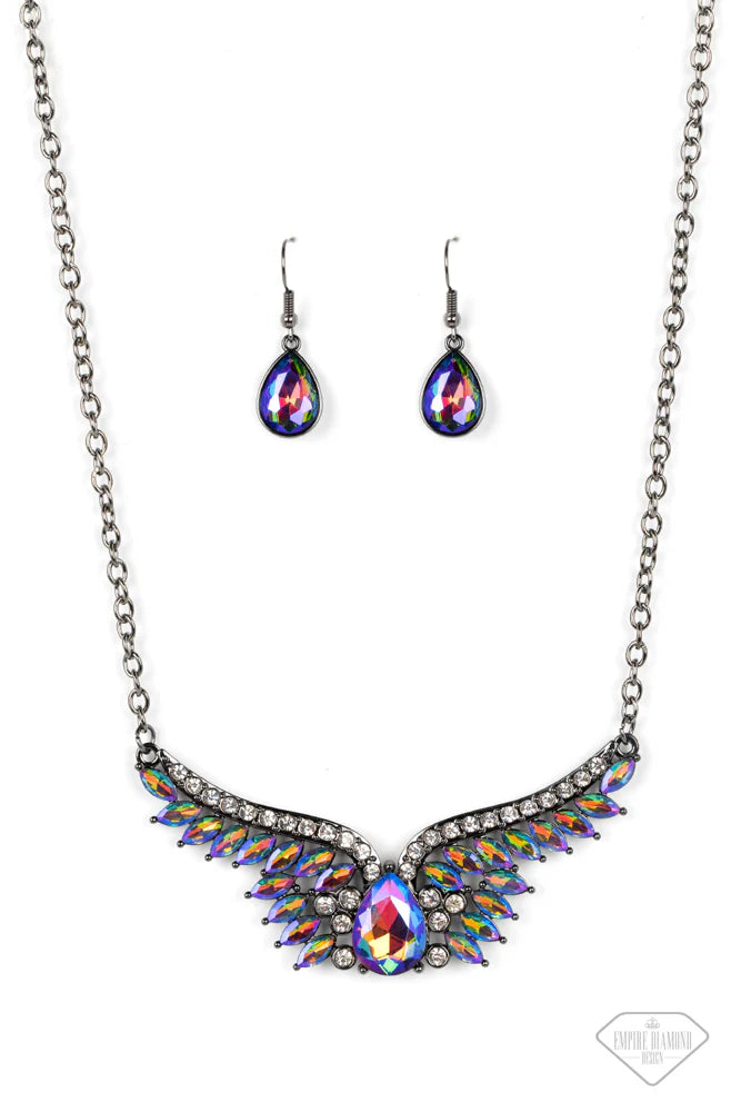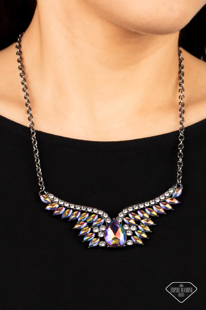 A smoldering collection of white rhinestones, marquise-cut oil spill rhinestones, and an oversized teardrop in the same oil spill shimmer daringly fan out from the collar, coalescing into an intense angel wing-inspired frame. The dauntless display of dazzle hangs from a classic gunmetal chain, leading the eye to the stunning sparkle. Features an adjustable clasp closure. Due to its prismatic palette, color may vary