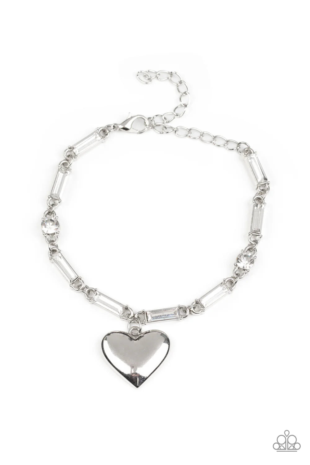 Encased in sleek silver fittings, round and emerald cut rhinestones delicately link into a sparkly chain around the wrist. A shiny silver heart charm swings from the glittery compilation, adding a flirtatious shimmer. Features an adjustable clasp closure