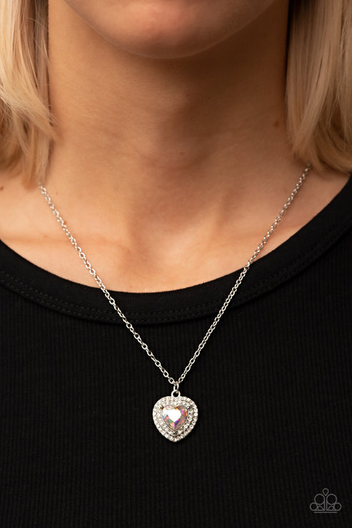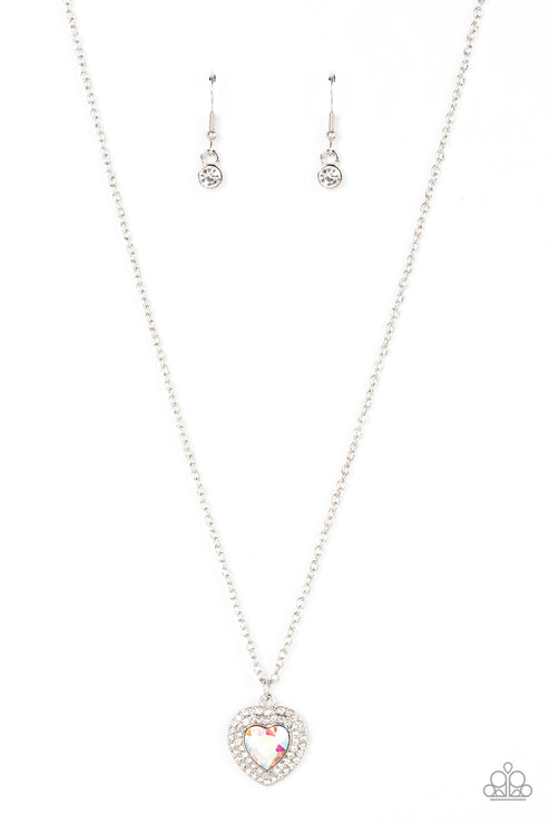 Bordered in stacked rows of glassy white rhinestones, a twinkly iridescent heart shaped gem sparkles at the center of a dainty silver chain for a flirtatious fashion. Features an adjustable clasp closure