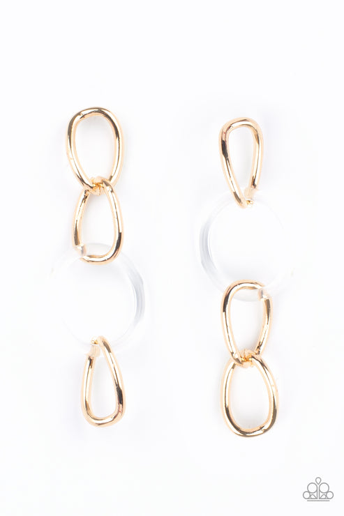 Bright gold oversized links, interrupted by a single large clear acrylic ring, fall from the ear in linked succession for an on-trend fashion statement. Earring attaches to a standard post fitting