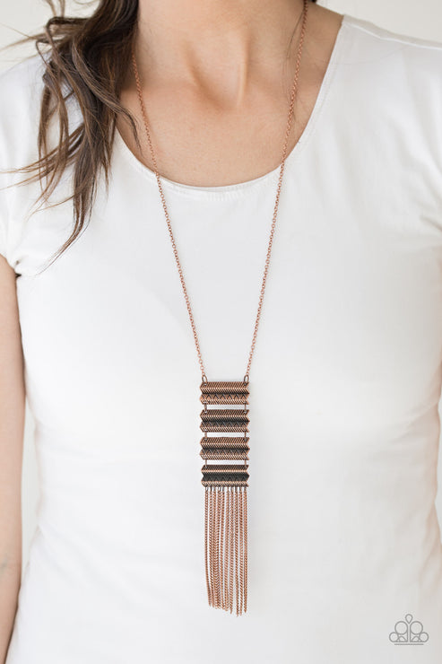 Etched in linear and edgy geometric patterns, crimped copper frames climb the torso, linking into a tribal inspired pendant. Swinging from the bottom of a lengthened copper chain, the stacked pendant gives way to a shimmery copper fringe for a seasonal finish. Features an adjustable clasp closure.