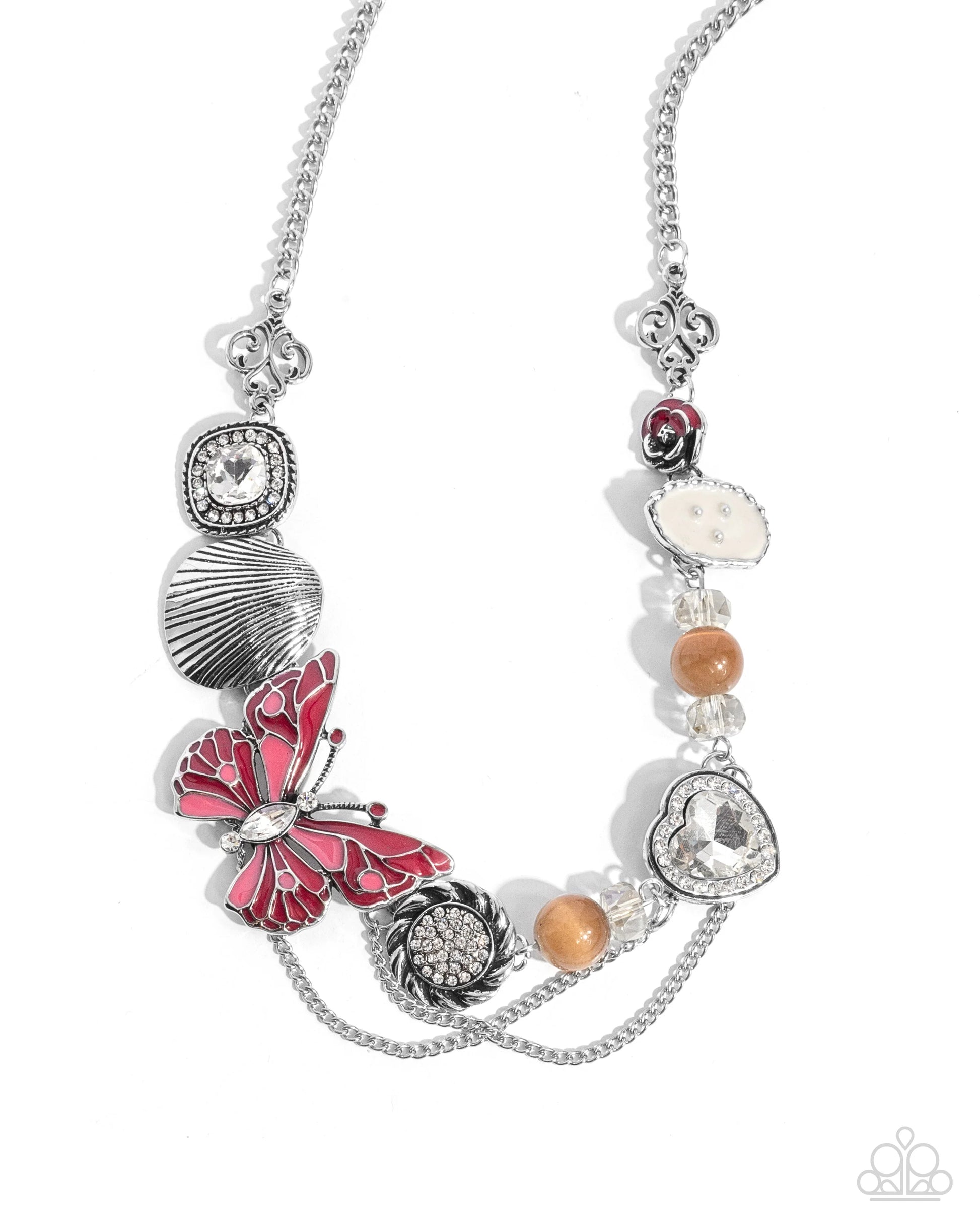 A silver seashell, a white rhinestone-bordered round gem in a rounded square frame, a silver fleur-de-lis, an oyster-inspired pearl-painted and pearl-dotted silver charm, clear faceted beads, brown cloudy beads, a white rhinestone-bordered white gem heart frame, a spiral-bordered white rhinestone-dusted disc, strands of classic silver chains, and a Desert Flower and Wine-painted butterfly with a white marquise-cut and round body and head connect to a classic silver chain below the neckline for a charming, whimsical display. Features an adjustable clasp closure